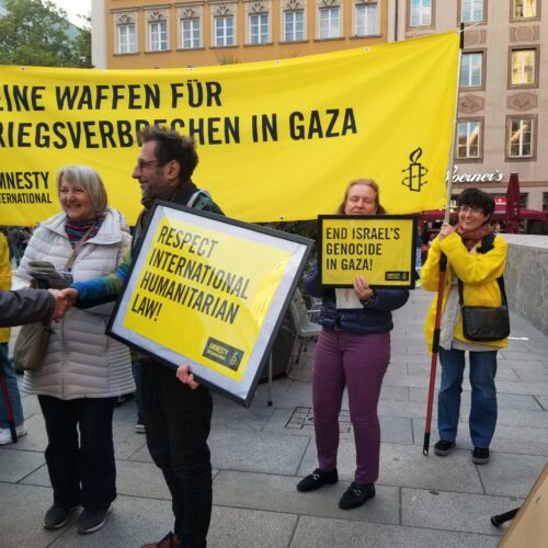 1000 Menschen waren gekommen, um am 2. Oktober 2025 am Marienplatz gegen die Waffenlieferungen der deutschen Regierung an Israel zu protestieren.