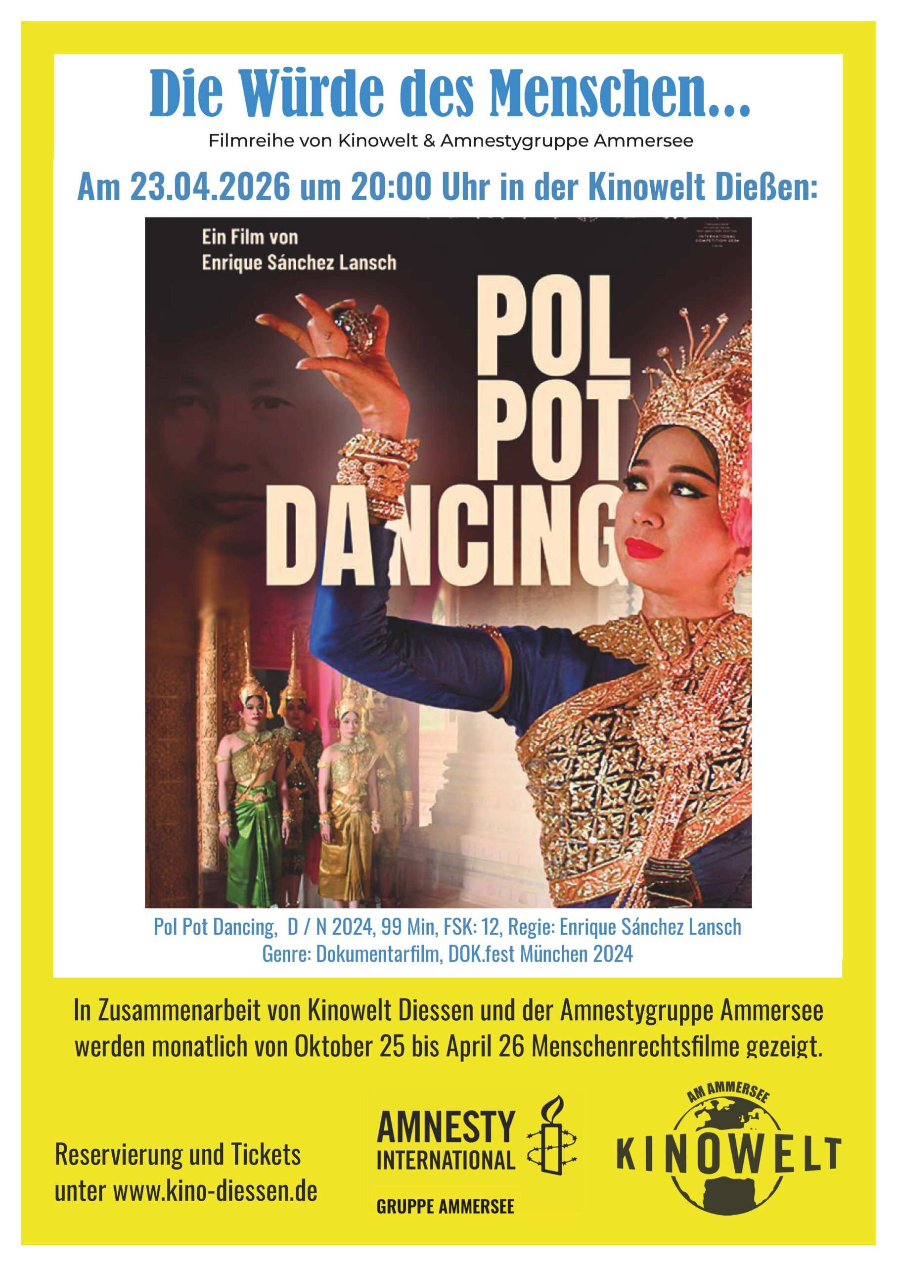 Der Tanz- und Historiendokumentarfilm Pol Pot Dancing von Erfolgsregisseur Enrique Sánchez Lansch (Rythm Is It!) erzählt auf verschiedenen zeitlichen Ebenen vom Werdegang und der Herrschaft Pol Pots, untrennbar verbunden mit dem klassischen kambodschanischen Tanz. Der Film kombiniert nie gesehenes Archivmaterial aus den 1920er bis 1990er Jahren, Originalinterviews und Choreografien, die die Geschichte Pol Pots nacherzählen, und geht auf Spurensuche bis in die Gegenwart. (Quelle: Jip Film & Verleih)