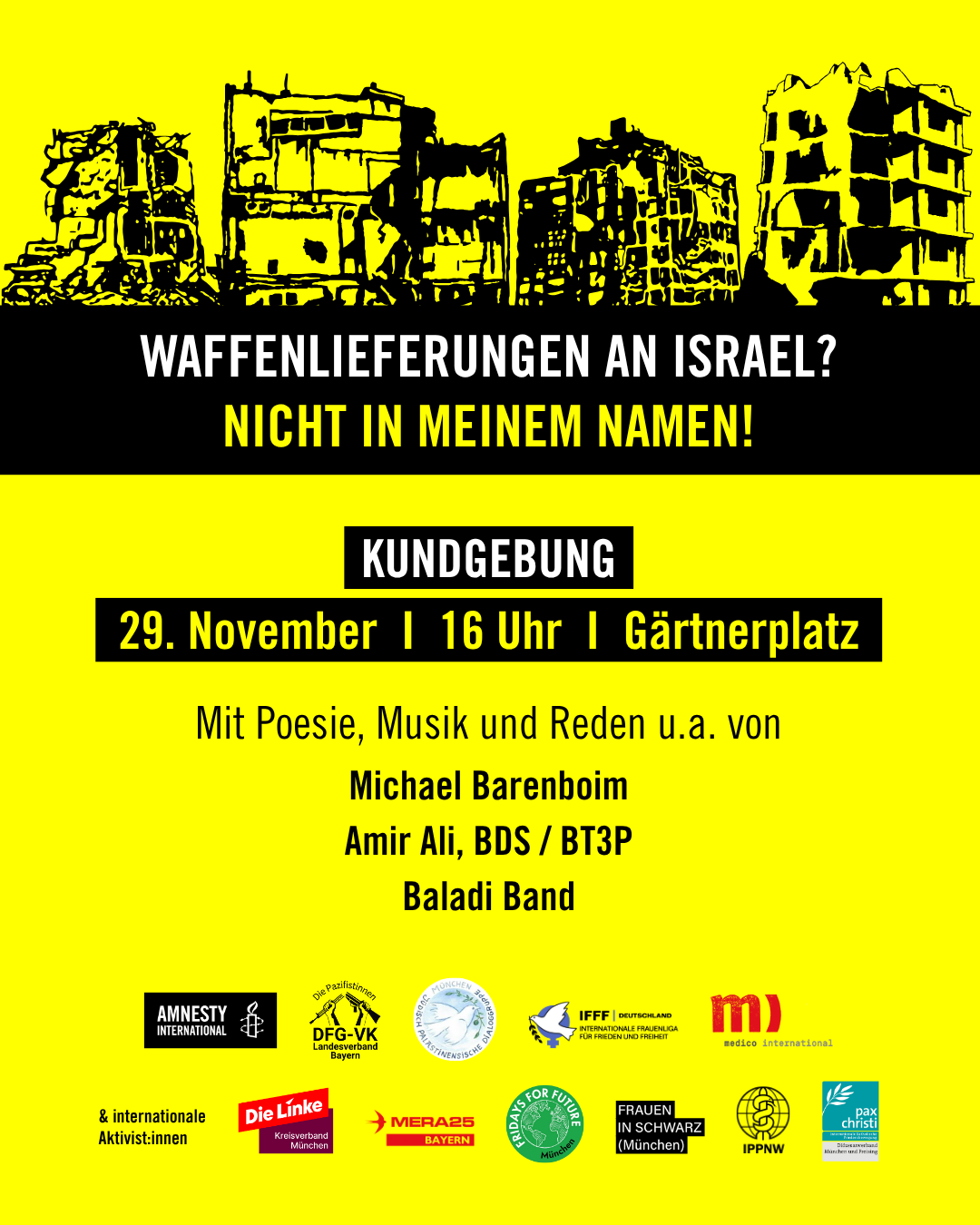 Die Kundgebung wird organisiert von Amnesty International Deutschland Bezirk München & Oberbayern, DFG-VK Landesverband Bayern, Die Linke Kreisverband München, Frauen in Schwarz (München), Fridays for Future München, Internationale Frauenliga für Frieden und Freiheit, IPPNW, Jüdisch-Palästinensische Dialoggruppe München, medico international, MERA25 Bayern, pax christi Diözesanverband München und Freising sowie internationalen Aktivist:innen.