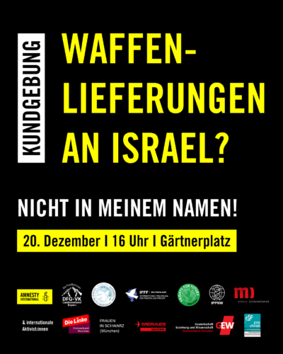 Die Kundgebung wird organisiert von Amnesty International Deutschland Bezirk München & Oberbayern, DFG-VK Landesverband Bayern, Die Linke Kreisverband München, Frauen in Schwarz (München), Fridays for Future München, GEW München (Gewerkschaft Erziehung und Wissenschaft Stadtverband München), Internationale Frauenliga für Frieden und Freiheit, IPPNW (International Physicians for the Prevention of Nuclear War), Jüdisch-Palästinensische Dialoggruppe München, medico international, MERA25 Bayern, pax christi Diözesanverband München und Freising sowie internationalen Aktivist:innen.