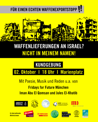 Die Kundgebung wird organisiert von Amnesty International Deutschland Bezirk München & Oberbayern, DFG-VK Landesverband Bayern, Die Linke Kreisverband München, Frauen in Schwarz (München), Fridays for Future München, Internationale Frauenliga für Frieden und Freiheit, IPPNW, Jüdisch-Palästinensische Dialoggruppe München, medico international, MERA25 Bayern, pax christi Diözesanverband München und Freising sowie internationalen Aktivist:innen.